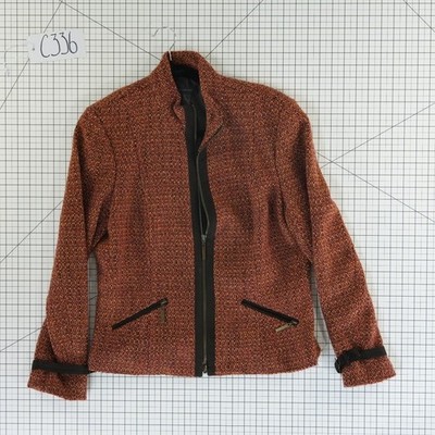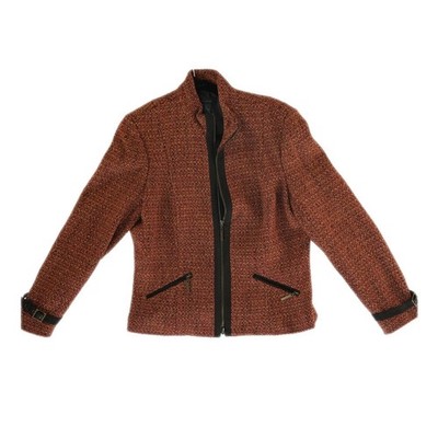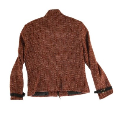 Sophisticated tweed jacket in a rich rust orange and brown weave, perfect for adding texture to professional or casual ensembles. This structured piece features a full-zip front with contrasting black trim, a mock neck collar, and functional zippered hand pockets. The long sleeves are accented with unique faux-leather buckle straps at the cuffs, adding a touch of modern edge to the classic wool-blend fabric. Fully lined for comfort, it offers a tailored silhouette that pairs effortlessly with trousers or denim.