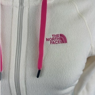 Winter white fleece hoodie from The North Face. Features a full zip closure, a hood with adjustable pink drawstrings, and the brand's logo embroidered on the chest in pink. A cozy and stylish piece, perfect for layering or wearing on its own. It would be great for hiking, casual outings, or a comfortable day at home.