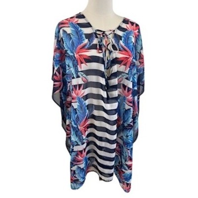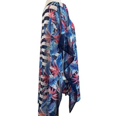 Tropical getaway vibes abound in this breezy Tommy Bahama poncho top. A captivating blend of bold navy and white stripes meets a vibrant floral pattern featuring red and blue leaves, creating a visually stunning piece. The sheer fabric adds an ethereal touch, while the lace-up neckline allows for adjustable comfort and style. Perfect for layering over a swimsuit at the beach, pairing with jeans for a casual brunch, or dressing up with a skirt for a summer evening out.