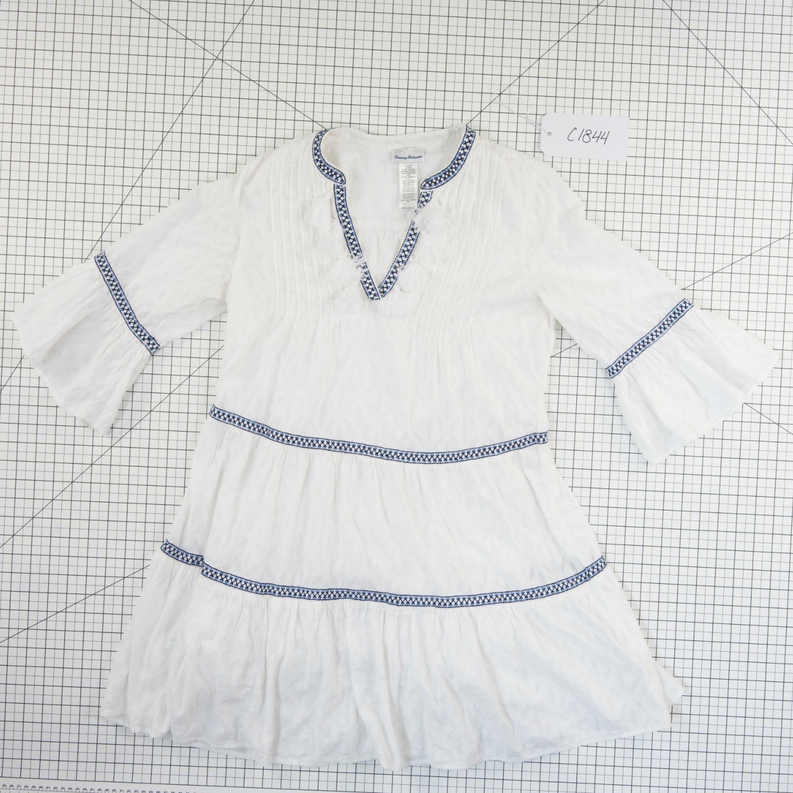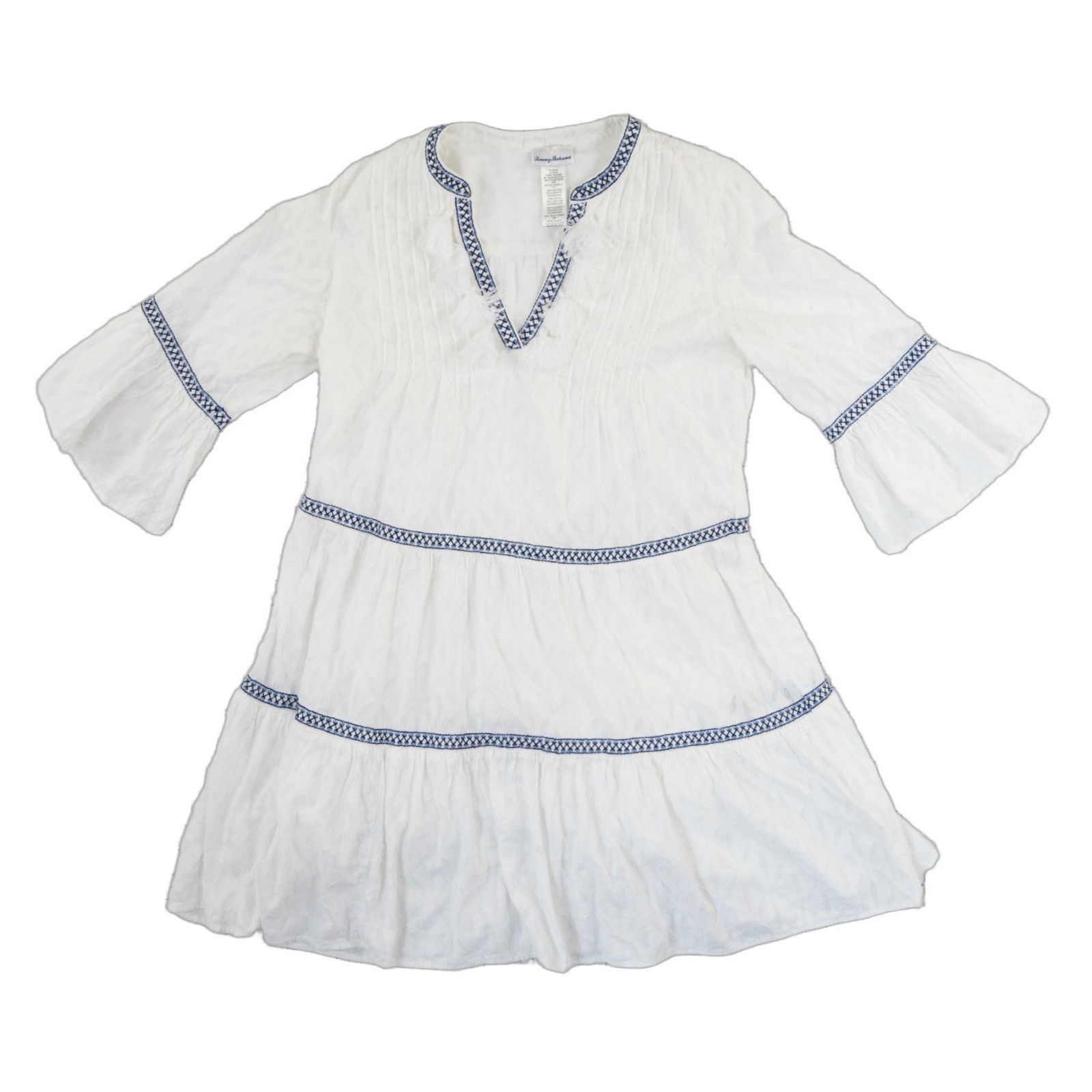 Excellent Condition! Tommy Bahama white cotton tunic dress features a breezy tiered silhouette with elegant blue geometric embroidery and playful fringe detailing along the V-neckline. Designed with 3/4 length bell sleeves and pintuck pleating at the chest, this lightweight cover-up or casual dress offers a relaxed, bohemian-inspired aesthetic perfect for coastal vacations or warm-weather outings. The crisp white fabric is accented by navy and light blue stitched trim that defines the tiers and cuffs, creating a polished yet effortless look.