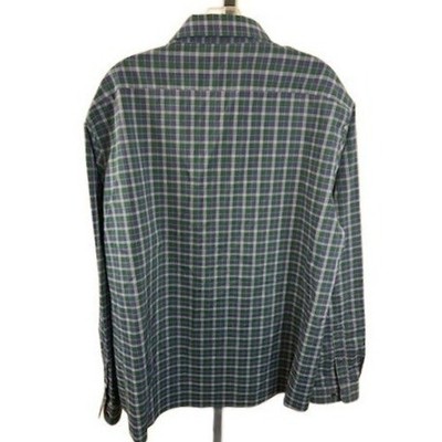 Tommy Hilfiger button down shirt with an athletic fit and stretch fabric. Measures 34 inches in sleeve length, and 25 inches pit to pit laid flat. This long-sleeve collared shirt features a classic plaid pattern in shades of green, blue, and white, with button closures at the front and cuffs. Perfect for casual outings, work, or layering.