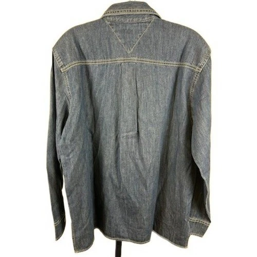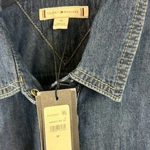 New with tags. Tommy Hilfiger chambray denim long sleeve shirt. A stylish pullover design featuring dual chest pockets with pearl snap closures and a pointed collar. The detailed stitching and classic denim wash offer a timeless appeal. Perfect for casual outings or layering for a relaxed yet polished look.