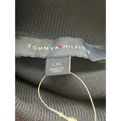 Keywords: Tommy Hilfiger, turtleneck sweater, navy blue, striped cuffs, long sleeve, knitwear, fall fashion, winter style, casual wear, preppy, classic, button detail