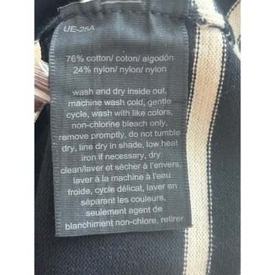 Tommy Hilfiger navy blue turtleneck sweater with striped cuffs. This stylish knit features a classic turtleneck design and contrasting white and navy stripes on the lower sleeves and hem for a touch of nautical flair. Four decorative silver-tone buttons adorn the left cuff, adding a subtle detail. Perfect for casual outings, layering during cooler months, or adding a polished touch to your everyday wardrobe.