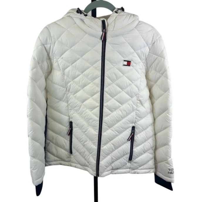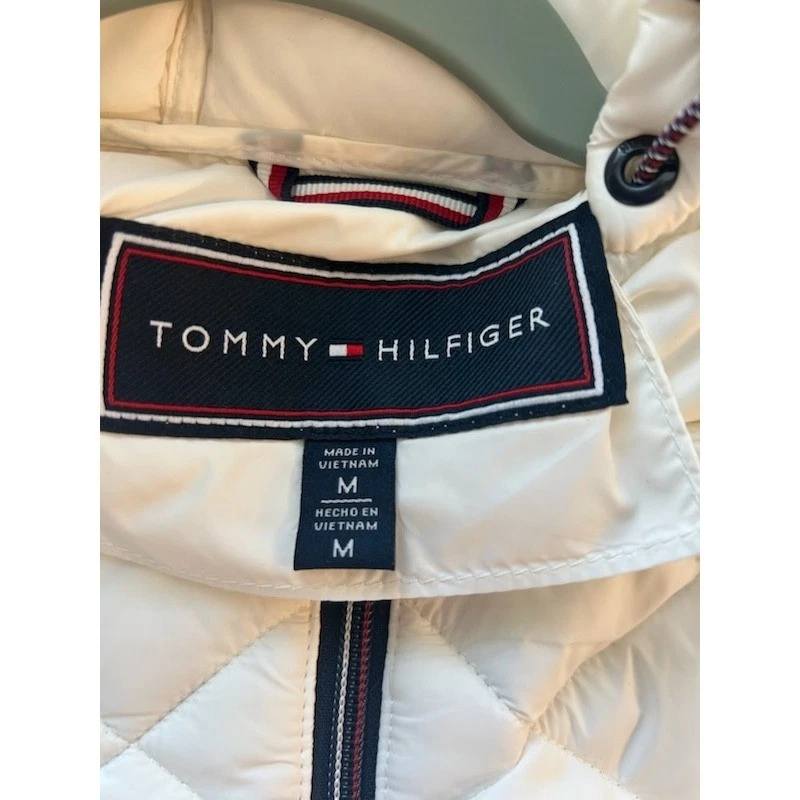 Stylish and versatile outerwear piece, this Tommy Hilfiger quilted puffer jacket combines fashion with functionality. This lightweight coat features a classic diamond-quilted design, offering warmth without being bulky. The jacket includes a hood for added protection against the elements, a full zip closure with iconic Tommy Hilfiger detailing, and two zippered hand pockets for convenience. The white color adds a touch of elegance, while the subtle logo on the chest provides brand recognition. Perfect for everyday wear, travel, or outdoor activities.