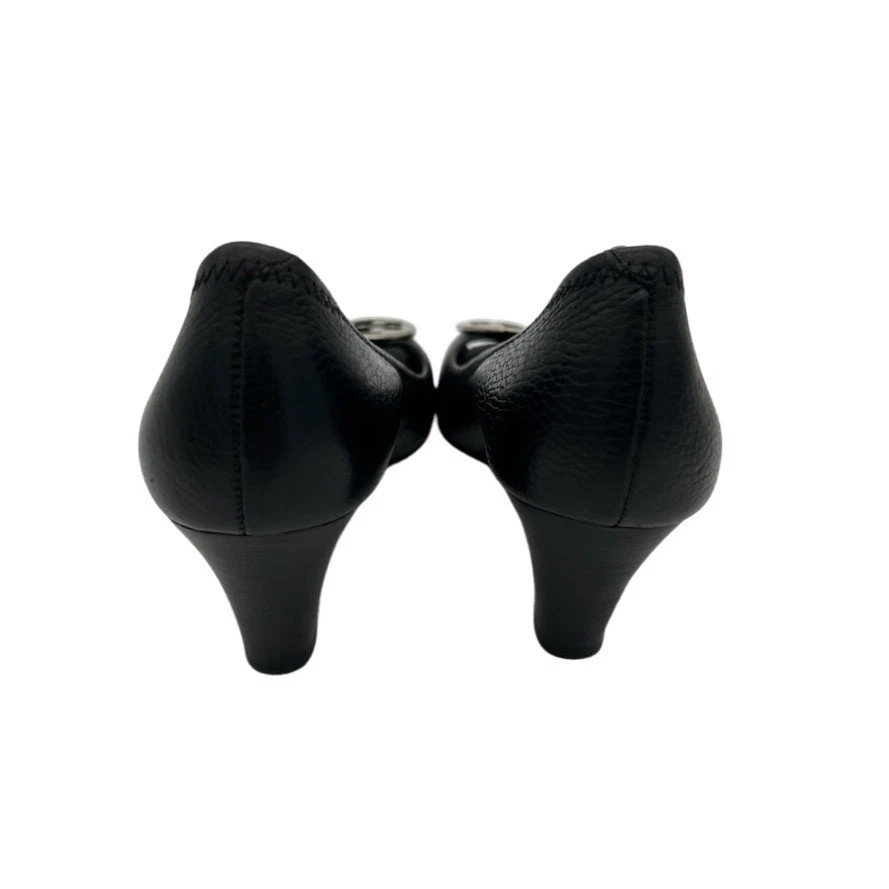 Elegant and sophisticated, these Tory Burch peep-toe heels are a timeless addition to any wardrobe. The classic black leather upper is complemented by a striking silver logo detail, adding a touch of modern flair. Featuring a comfortable heel height and a sleek silhouette, these shoes are perfect for dressing up or down. Their versatility makes them ideal for a night out, a formal event, or even a day at the office, adding a refined finish to any ensemble.