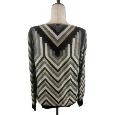 Keywords: Trina Turk sweater, geometric sweater, chevron sweater, long sleeve sweater, pullover sweater, gray sweater, black sweater, metallic gold, boat neck, contemporary sweater, designer sweater, stylish sweater, modern sweater, size medium
