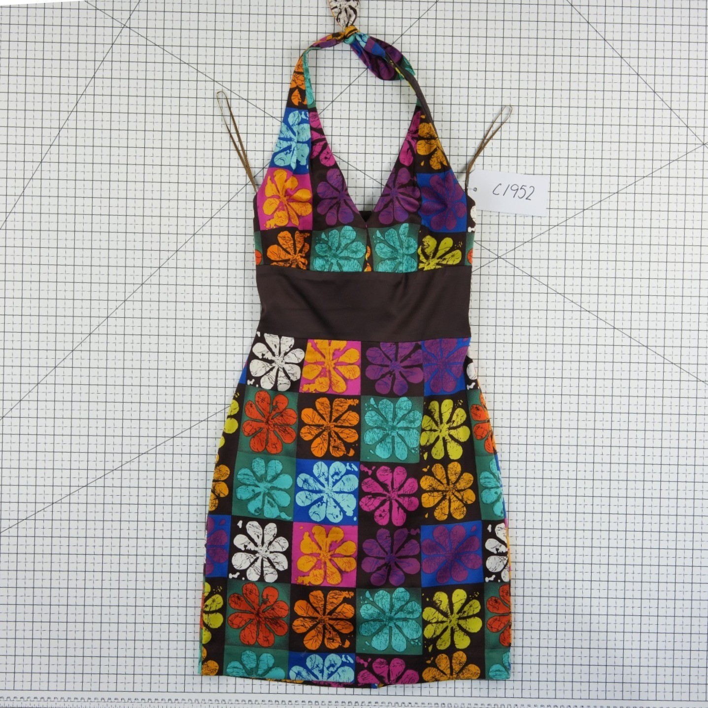 Excellent Condition! Vibrant Trina Turk halter dress showcases a stunning multi-color floral grid pattern with a distinct mid-century modern influence. Crafted from a luxurious cotton and silk blend, this mini dress features a flattering V-neckline, a wide chocolate brown empire waistband, and an elegant tie-back halter neck. The back is finished with a charming bow detail and a concealed zipper, making it a perfect choice for summer garden parties, tropical vacations, or retro-inspired events.