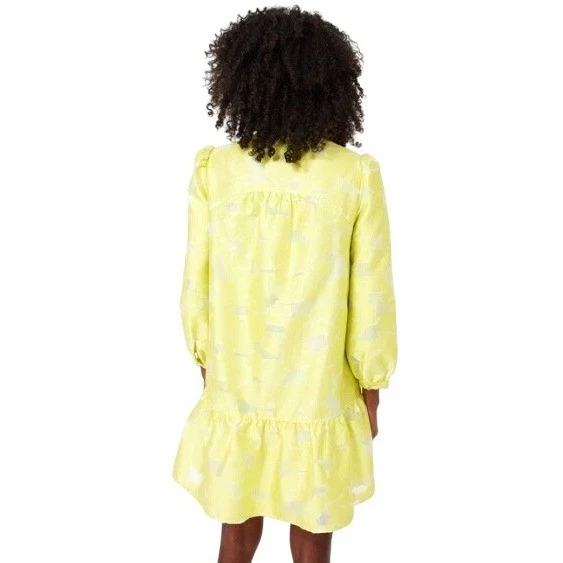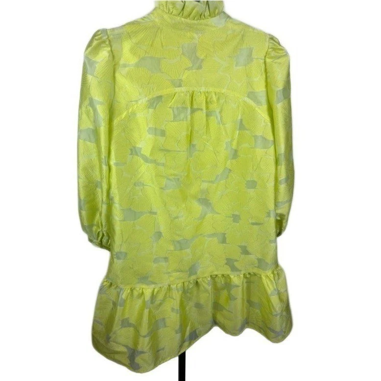 A vibrant yellow mini dress with a striking floral jacquard pattern. This dress features a charming high neckline with delicate ruffle detailing, a flattering V-neckline, and voluminous long puff sleeves that add a touch of drama. The tiered design culminates in a playful ruffle hem, creating a chic silhouette. Perfect for garden parties, brunch with friends, or a stylish evening out.