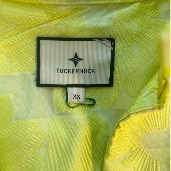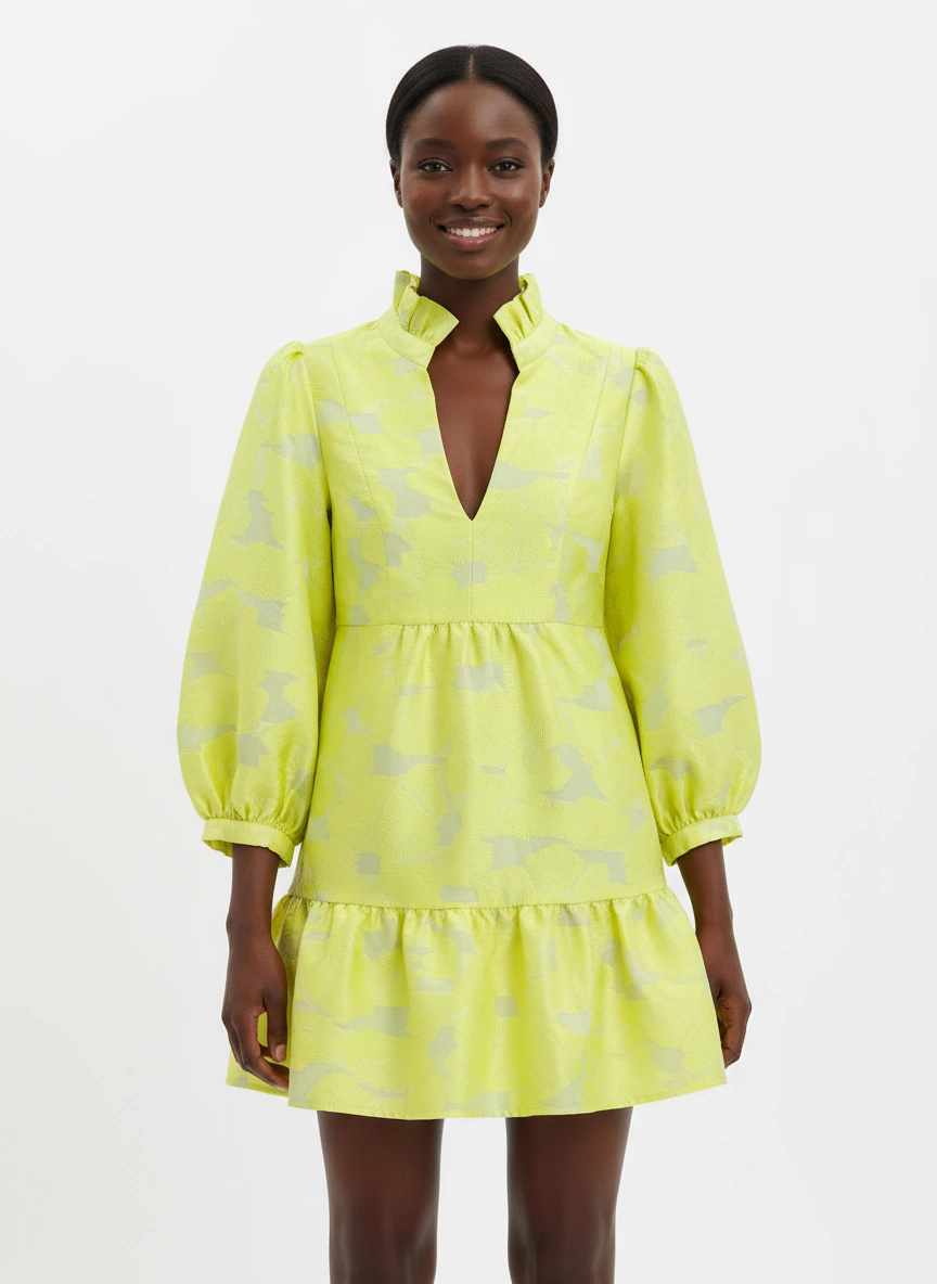 A vibrant yellow mini dress with a striking floral jacquard pattern. This dress features a charming high neckline with delicate ruffle detailing, a flattering V-neckline, and voluminous long puff sleeves that add a touch of drama. The tiered design culminates in a playful ruffle hem, creating a chic silhouette. Perfect for garden parties, brunch with friends, or a stylish evening out.