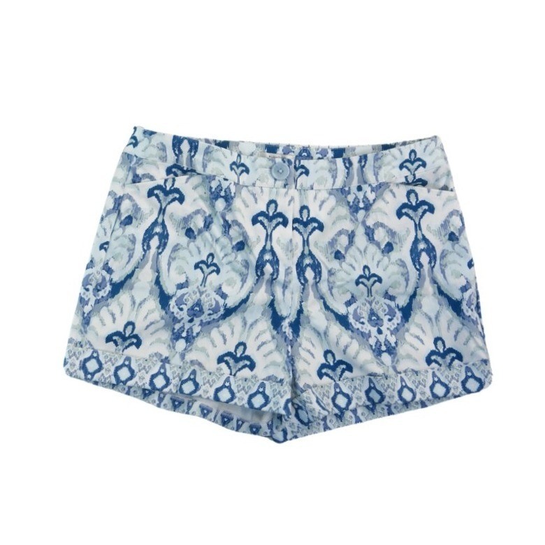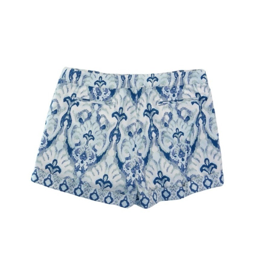 Excellent Condition! Vibrant ikat damask print shorts offer a sophisticated take on casual summer wear. Crafted from a comfortable cotton blend with a hint of stretch, these bottoms feature a classic mid-rise silhouette with a button and zip fly closure. The intricate blue and white pattern is complemented by a decorative border at the hem, while front slant pockets and rear welt pockets add functional detail. Perfect for a coastal getaway or a polished weekend look.