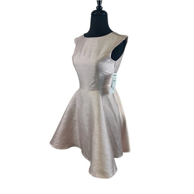 A vision of modern elegance, this Un Deux Trois dress is ready to turn heads at your next special event. The subtle pink hue is infused with a metallic shimmer, catching the light with every move. The sleeveless design and flattering fit-and-flare silhouette create a youthful and sophisticated look. The dress features a round neckline in the front and a V-neckline in the back, adding a touch of allure. Imagine yourself twirling on the dance floor at a wedding reception, making a grand entrance at a cocktail party, or enjoying a sophisticated dinner date in this stunning dress.