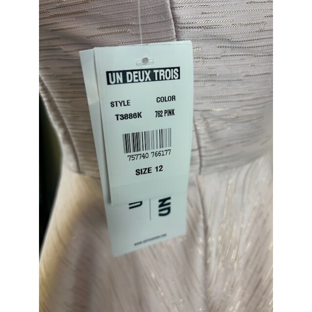 Keywords: Un Deux Trois dress, pink dress, metallic dress, party dress, cocktail dress, fit and flare dress, sleeveless dress, special occasion dress, size 12 dress, women's dress, formal dress, evening dress, UDTFASHION.
