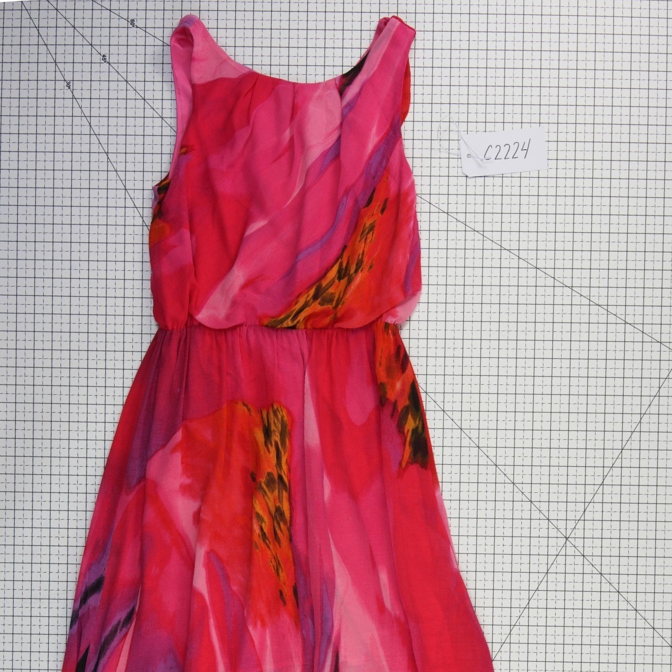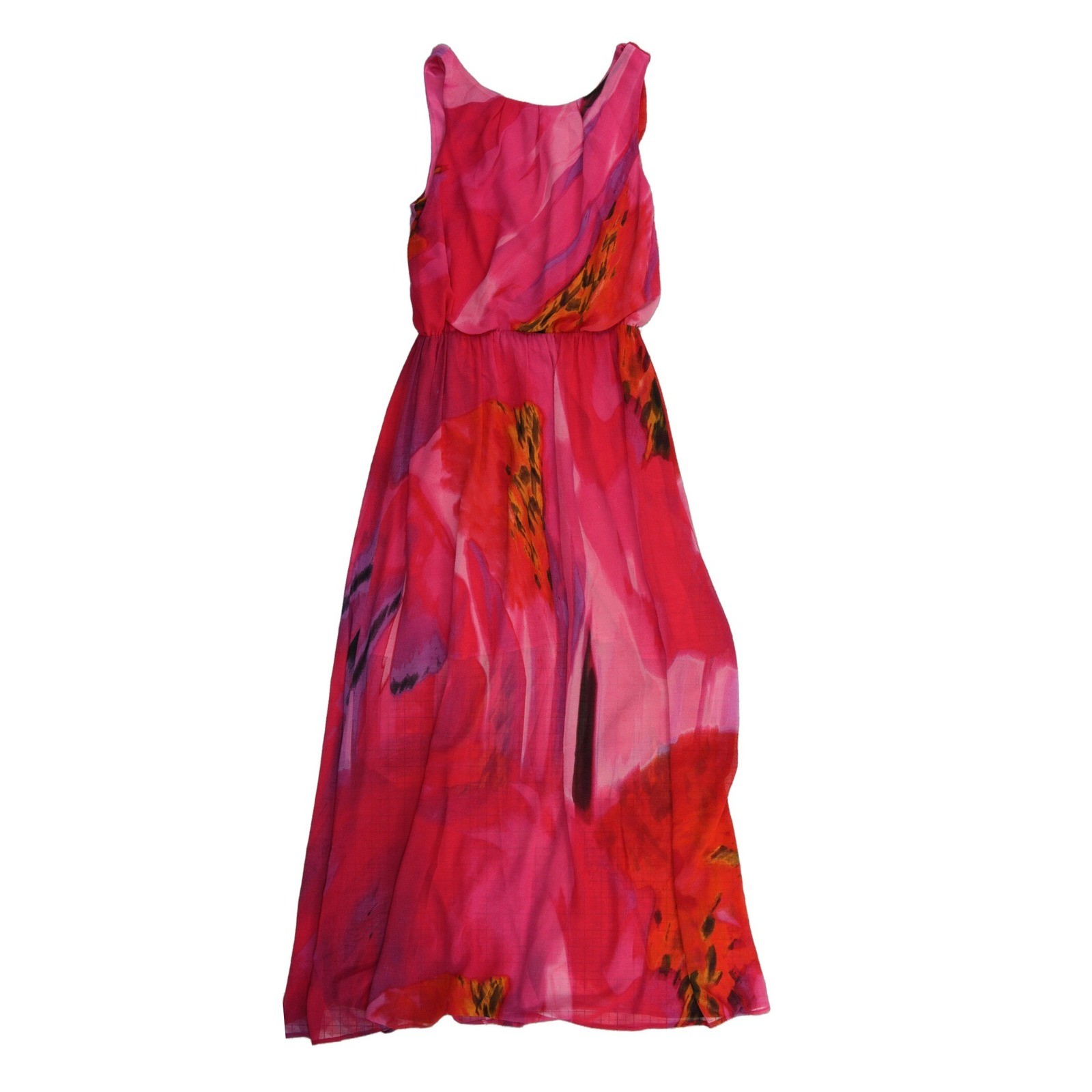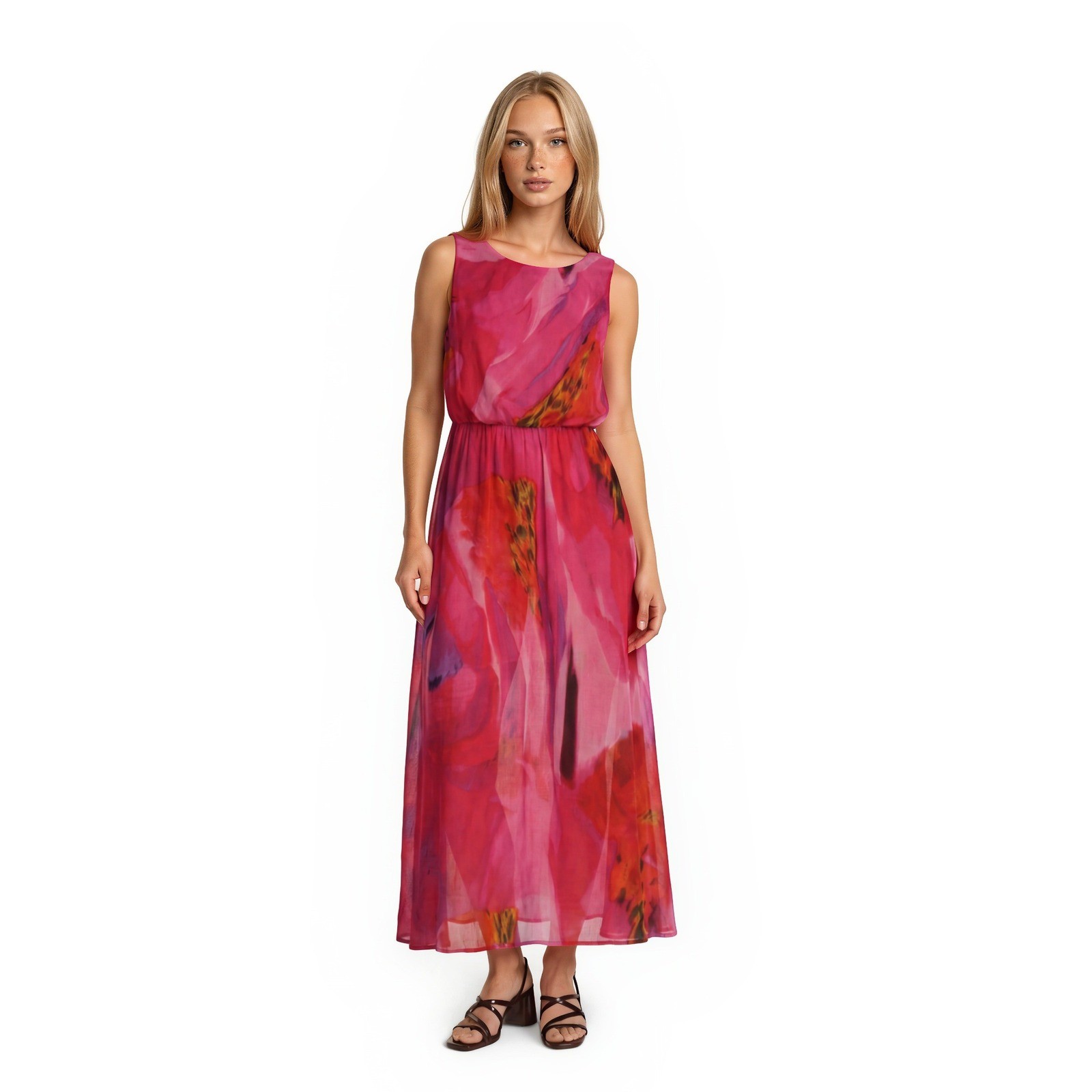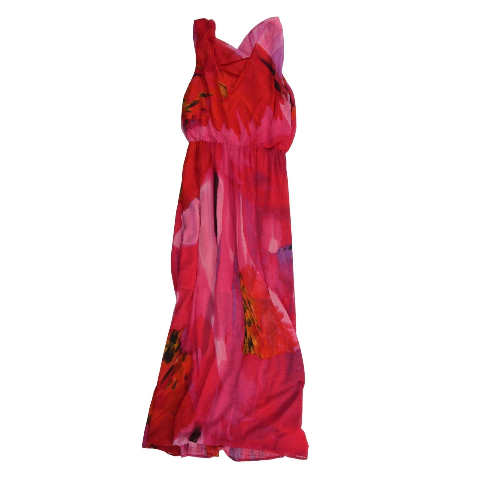 Excellent Condition! Vibrant maxi dress showcases a stunning abstract floral watercolor print in shades of pink, red, and purple. Designed with a sleeveless silhouette and a sophisticated high neckline, it features an elasticized waist for a comfortable, defined fit. The lightweight chiffon fabric flows beautifully into a full-length skirt, while the smooth lining ensures coverage and comfort. Perfect for garden parties, summer weddings, or elegant vacations.