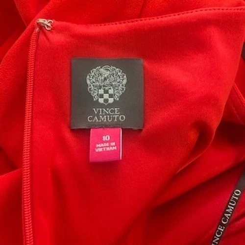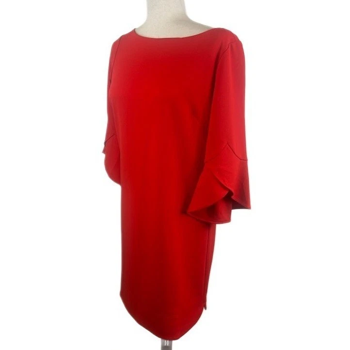 A vibrant red Vince Camuto sheath dress with striking bell sleeves. This elegant dress offers a flattering silhouette perfect for making a statement. Designed for versatility, it transitions seamlessly from a professional setting to a sophisticated evening out.