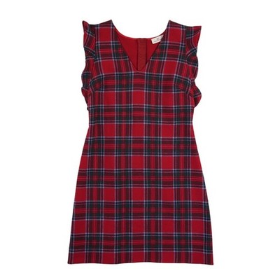Excellent Condition! Classic plaid shift dress in a vibrant red tartan pattern with subtle metallic thread detailing for a festive touch. This sleeveless piece features a flattering V-neckline and playful ruffle trim at the shoulders, transitioning into a straight silhouette. Crafted from a comfortable stretch blend, it includes a hidden back zipper closure and is fully lined for a smooth fit.