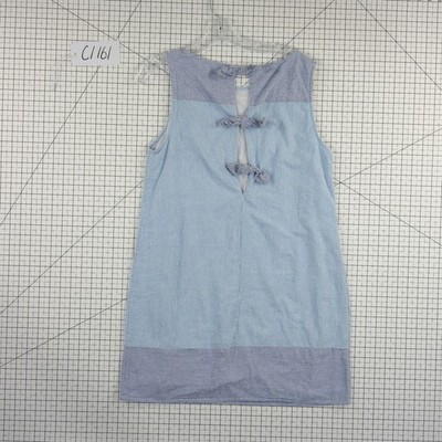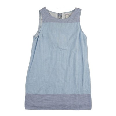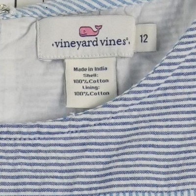 Excellent condition! Vineyard Vines sleeveless shift dress in a classic blue and white pinstripe seersucker. This lightweight cotton piece features a charming triple bow back detail with keyhole openings and a contrasting horizontal stripe pattern at the yoke and hem for a nautical touch. The fully lined construction ensures a structured yet breathable fit, perfect for summer outings or coastal events.