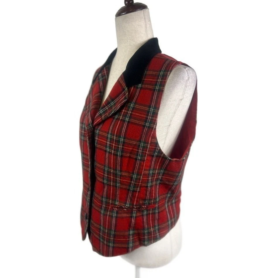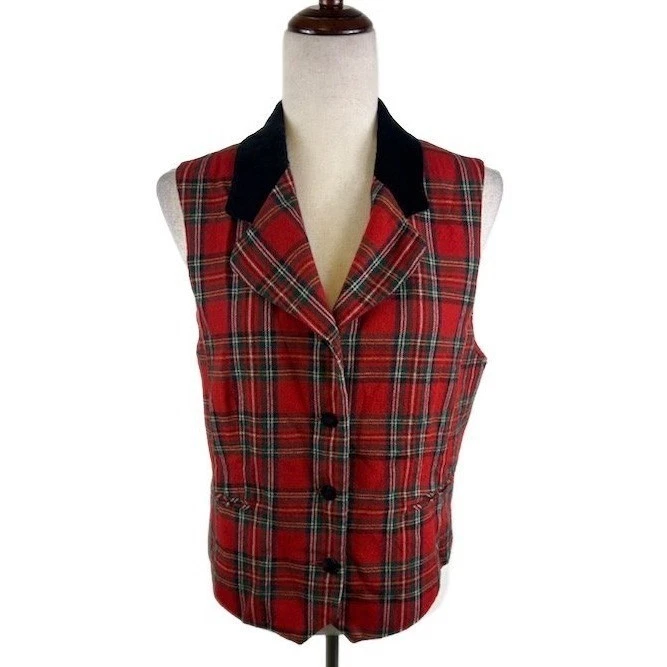 Excellent condition, and super vintage! A sophisticated vintage vest, ideal for adding a touch of classic charm to any ensemble. This plaid vest features a notched velvet collar and a flattering tailored fit with a three-button closure. The timeless plaid pattern in red, green, and yellow offers versatile styling options. Great for layering during the fall, wearing as a stateme