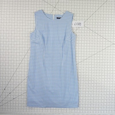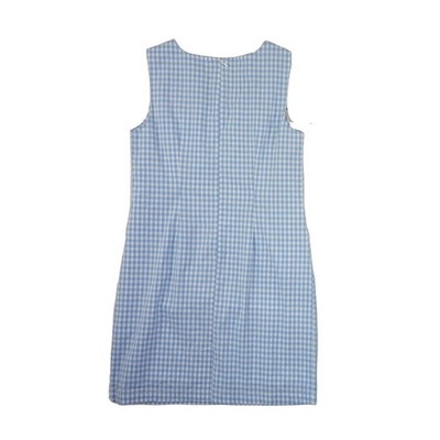 Excellent Condition, looks like new! Classic sleeveless sheath dress features a timeless light blue and white gingham pattern, perfect for warm-weather outings. Crafted from a comfortable cotton blend with a hint of stretch, it offers a structured yet flexible fit. The design includes a clean round neckline, darting for a tailored silhouette, and a discreet back zipper closure. Fully lined for quality and comfort, this versatile piece transitions effortlessly from casual daytime events to more polished occasions.