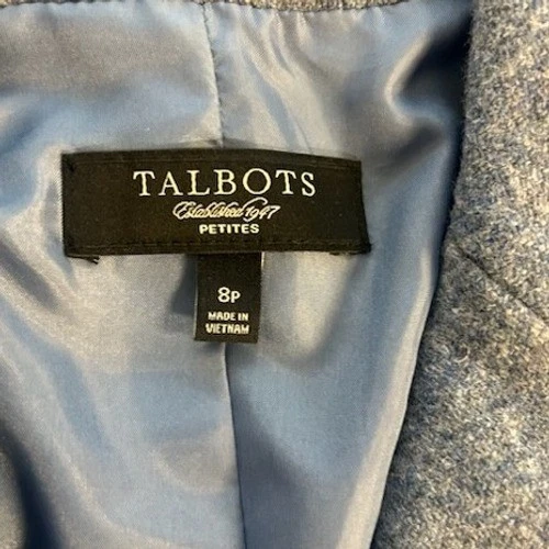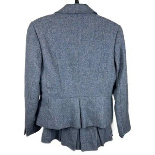 A stylish Talbots petite suit set including a blazer and skirt. The tailored blazer features a classic notched lapel, a single-breasted front with three decorative buttons, and flattering pleating details at the waist. The accompanying skirt offers a sophisticated pencil silhouette with elegant pleats at the hem. This versatile ensemble is perfect for professional settings, business events, or a polished evening out.
