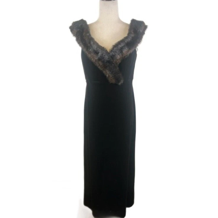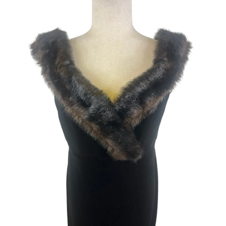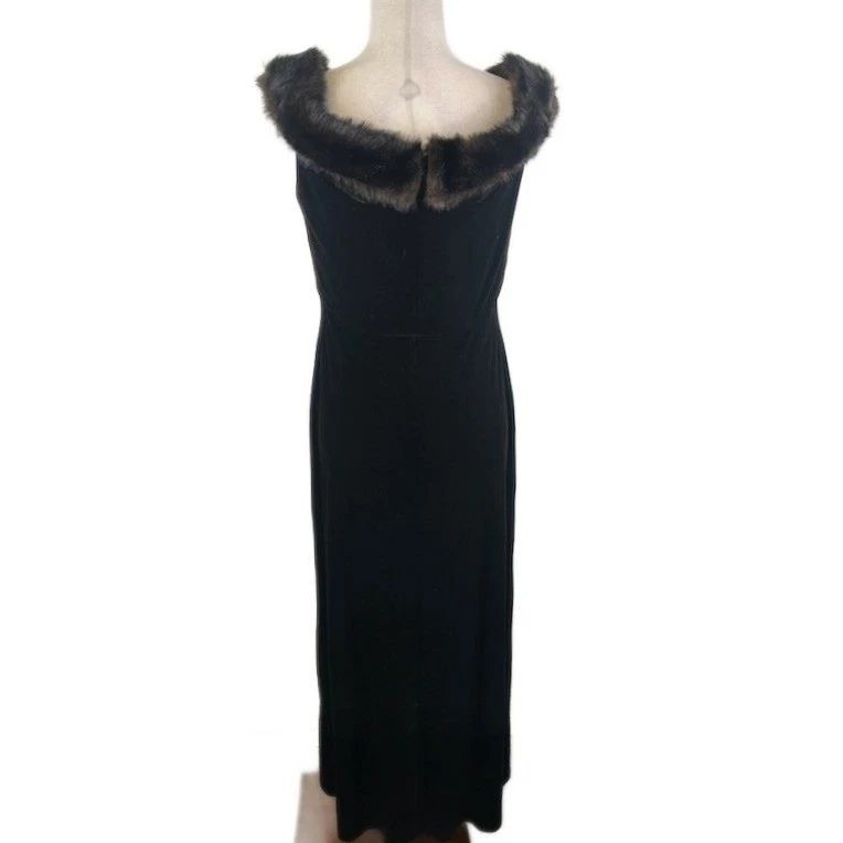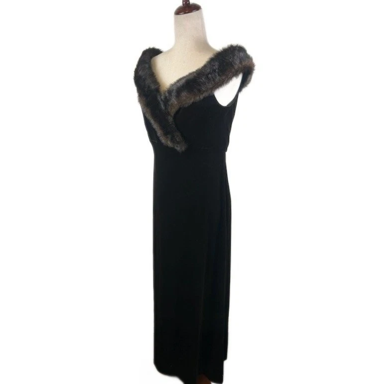 Excellent condition! Sophisticated evening dress with a touch of vintage glamour. This elegant black maxi dress features a luxurious faux fur shawl collar that adds a dramatic focal point. The sleeveless design and form-fitting silhouette create a flattering shape, while the full-length skirt exudes timeless grace. Its velvet material offers both visual appeal and a comfortable fit, making it an ideal choice for formal events, black-tie affairs, or special occasions where a sophisticated statement is desired.
