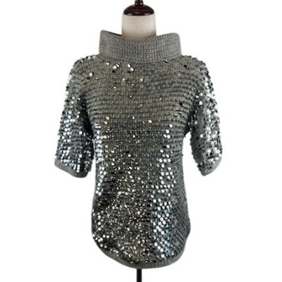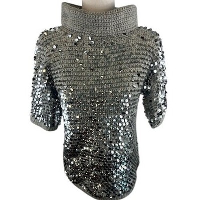 Keywords: sequin sweater, embellished top, knit turtleneck, short sleeve sweater, gray sweater, sparkly top, holiday sweater, party top, womens sweater, sequin top, turtleneck top, statement sweater, dressy casual, retro style