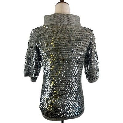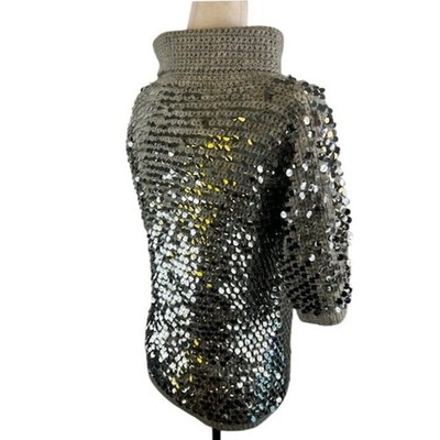 Eye-catching sweater top featuring a unique blend of cozy knit construction and glamorous embellishments. This striking piece showcases a comfortable turtleneck and short sleeves, ideal for transitional weather. Shimmering sequins adorn the entirety of the sweater, catching the light with every movement and adding a touch of sparkle to your ensemble. The neutral gray hue serves as a versatile backdrop, allowing the sequins to truly pop and making it easy to pair with various bottoms. Perfect for adding a touch of glamour to a casual brunch, elevating an evening date outfit, or making a statement at a holiday gathering.