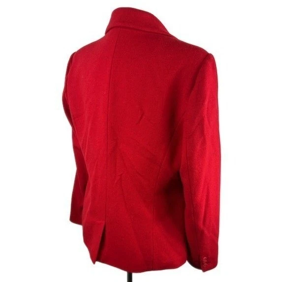 Classic and sophisticated, a wool blend blazer in vibrant red. Featuring a timeless two-button front closure and a stylish crest patch, this blazer adds a touch of elegance to any outfit. With its notched lapel and flattering silhouette, it is a versatile piece that can be dressed up or down. Great for a business meeting, a special occasion, or a stylish night out.