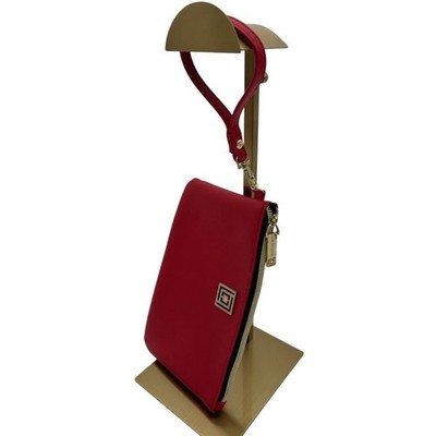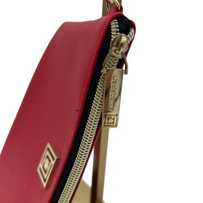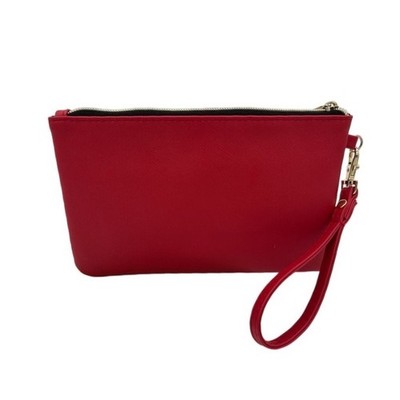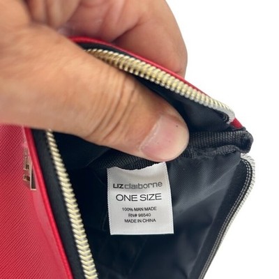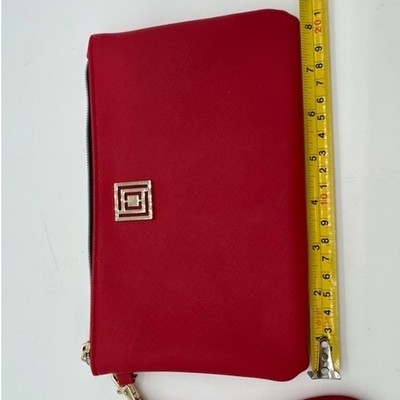 Keywords: Liz Claiborne, red wristlet, clutch, handbag, zip around, wallet, purse, gold hardware, detachable strap, evening bag, travel clutch, small bag, red purse
