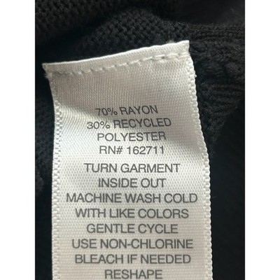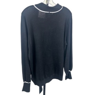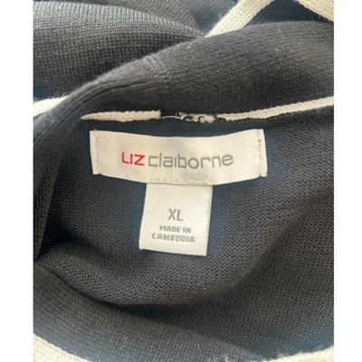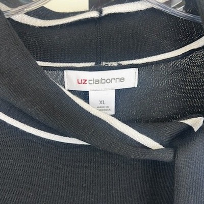 Liz Claiborne black knit top with elegant white trim details. This sweater features a sophisticated draped neckline and full-length sleeves with banded cuffs. Perfect for a polished look at the office or a chic evening out.