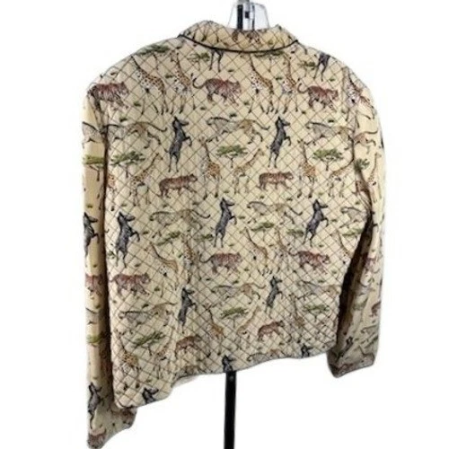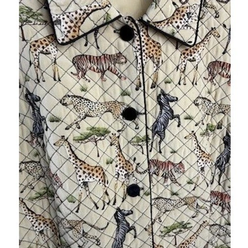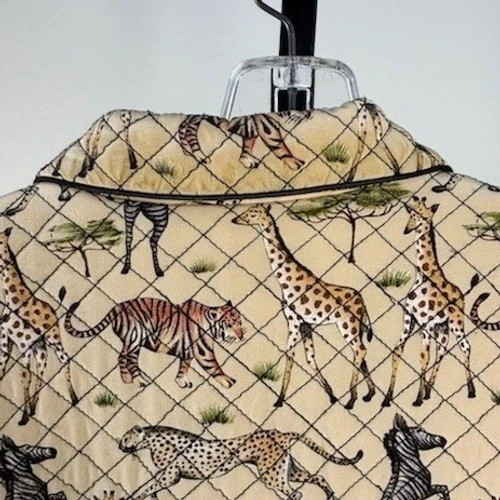 This unique piece showcases a playful pattern of giraffes, zebras, tigers, and cheetahs set against a diamond-quilted background with black trim. Features a classic collar and button-front closure for a polished look. Ideal for adding a touch of adventurous style to casual outings or a themed event.
