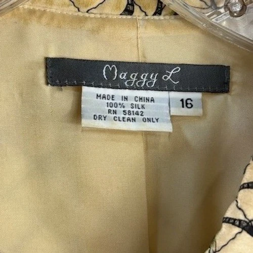 This is a very vintage silk Maggie L jacket. It measures 23 inches in length, has a 25 inch sleeve length and is 22 inches pit to pit laid flat.