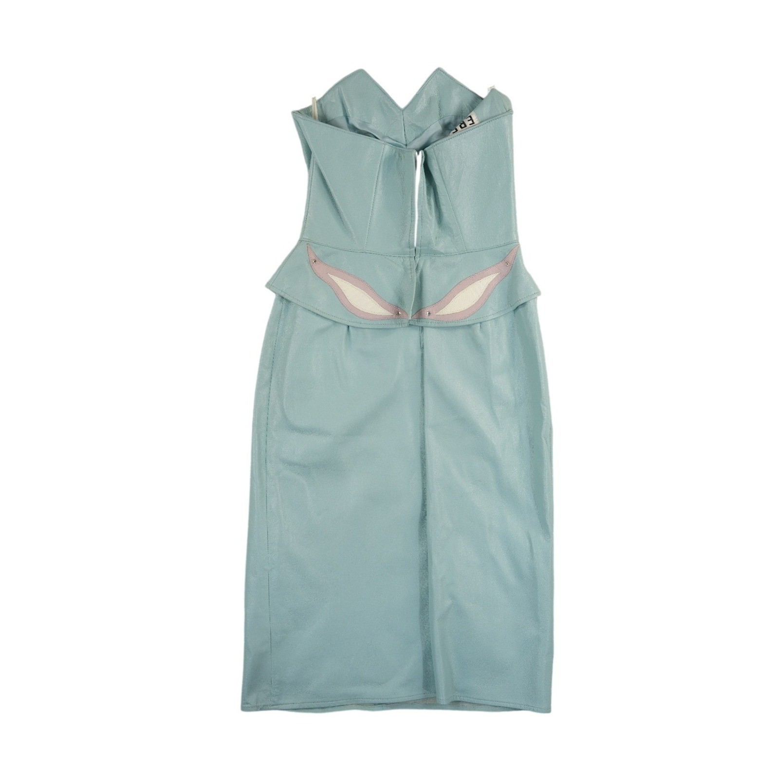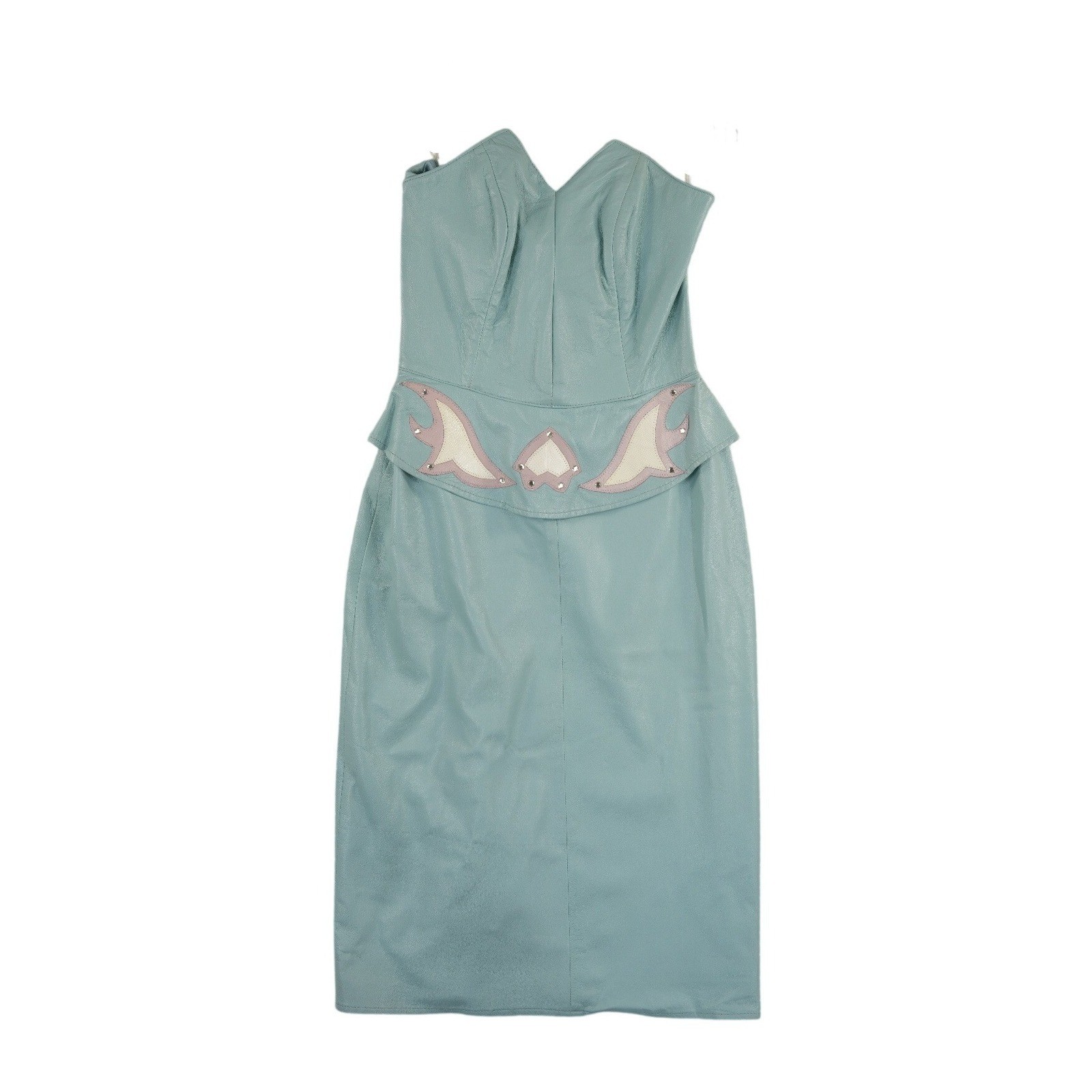 Excellent Condition! Vintage North Beach Leather by Michael Hoban strapless dress showcases a stunning light blue leather construction with a unique peplum waist. This 1980s statement piece features a sweetheart neckline, structured bodice, and intricate flame-like appliqué detailing at the waist accented with small studs. The pencil-style skirt creates a sleek silhouette, making it a perfect example of high-end vintage glamour.