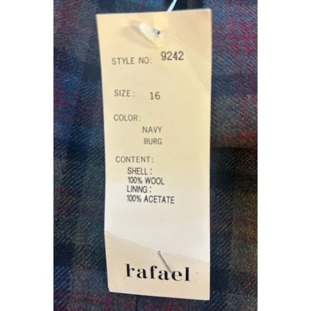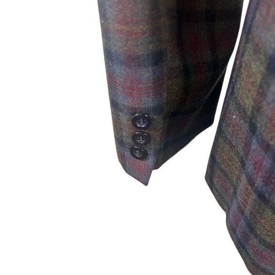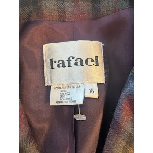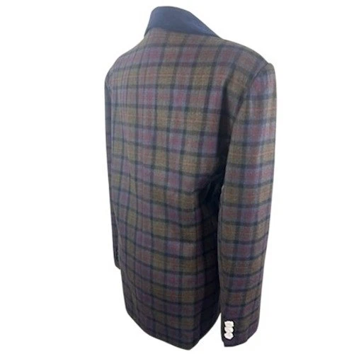 Vintage and NWT, Rare! Stylish plaid blazer by Rafael, offering a sophisticated touch to any wardrobe. This tailored jacket features a classic plaid pattern in a blend of navy, burgundy, and olive tones. Its design is elevated by a navy velvet collar. The blazer is fully lined with a smooth acetate fabric and includes a three-button front closure and two flap pockets, blending functionality with style. Suitable for a polished office look, a smart-casual weekend outing, or adding a refined layer to evening attire.
