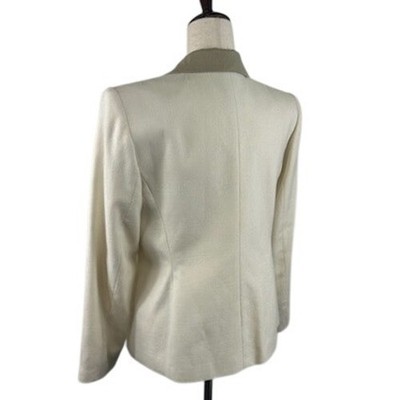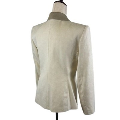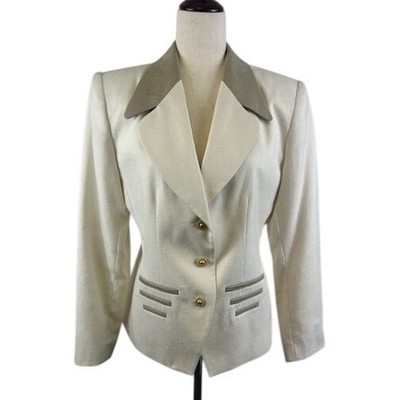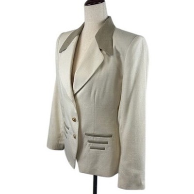 Commanding attention, this vintage Sasson blazer exudes sophisticated charm with its tailored silhouette. Featuring a creamy beige hue, the blazer is elevated by touches of contrasting tan on the collar and faux pockets. Gold-tone buttons add a luxe touch. Perfect for closing deals at a business meeting, turning heads at a formal event, or making a stylish statement at a wedding.