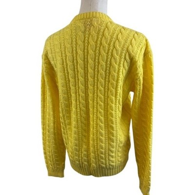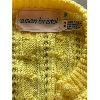 Keywords: Susan Bristol, vintage cardigan, yellow cardigan, cable knit, wool blend, button down sweater, 80s sweater, retro sweater, womens cardigan, classic cardigan, preppy sweater, grandmacore, coastal grandmother, yellow knitwear
