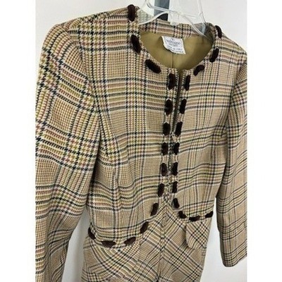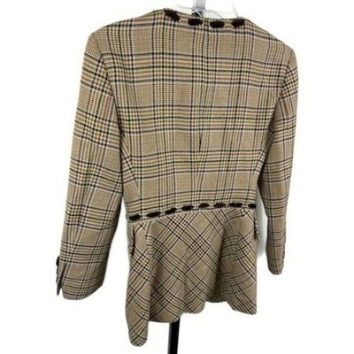 Vintage Valentino Boutique plaid blazer jacket with striking velvet trim, excellent condition!! This elegant piece features a distinctive front closure with decorative buttons and a tailored silhouette. The rich plaid pattern, combined with the luxurious velvet accents, creates a sophisticated look perfect for business meetings or a chic evening out.