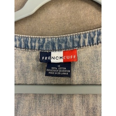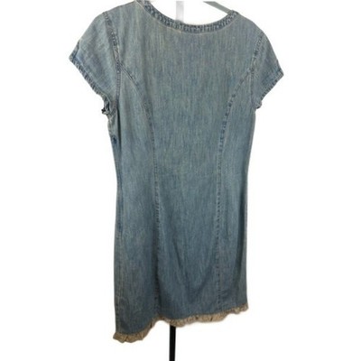 Keywords: denim dress, jean dress, lace up dress, casual dress, short sleeve dress, blue dress, french cuff, vintage dress, size 10, cotton dress, lace trim dress, denim, summer dress