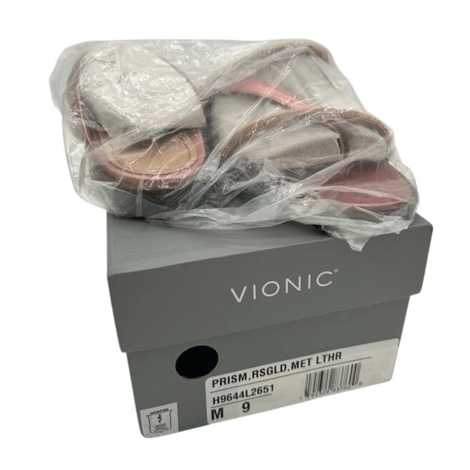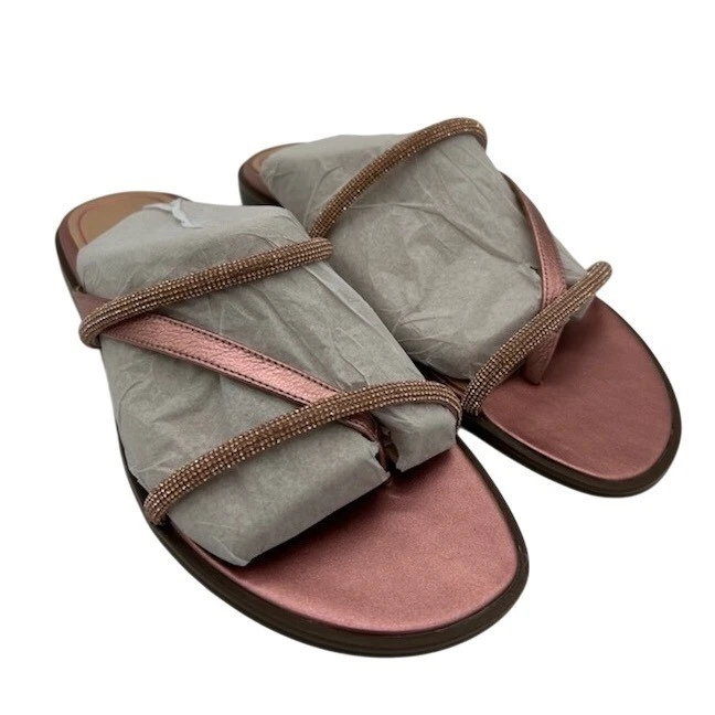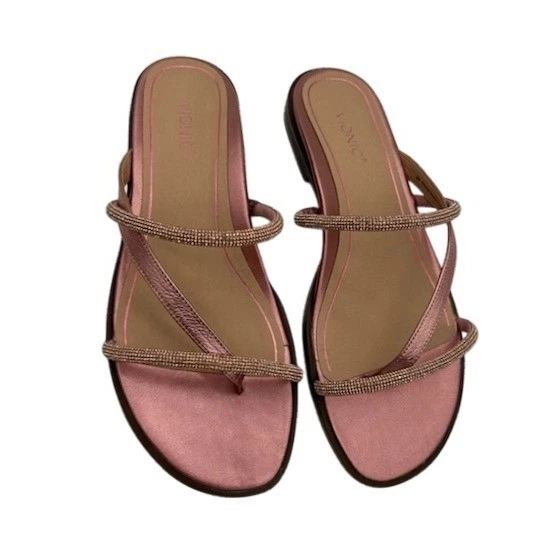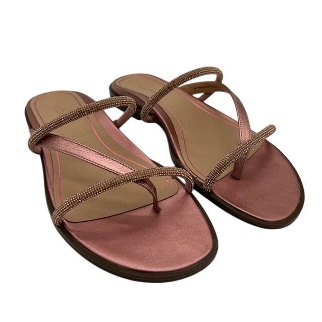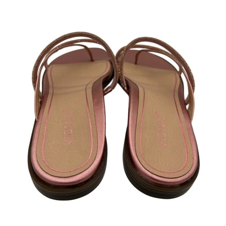 Stylish strappy sandals perfect for adding a touch of sparkle to your outfit. These rose gold metallic leather sandals from Vionic feature a comfortable thong style with delicate rhinestone embellishments on the straps. The design offers both elegance and support, making them ideal for both casual and dressier occasions. These sandals are perfect for a summer brunch, a casual evening out, or even a day at the beach.