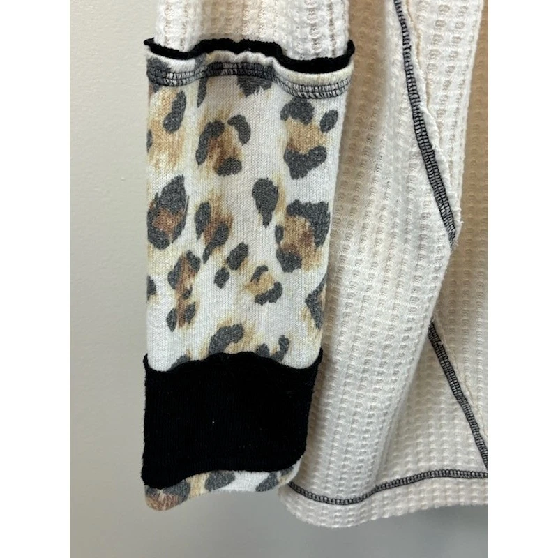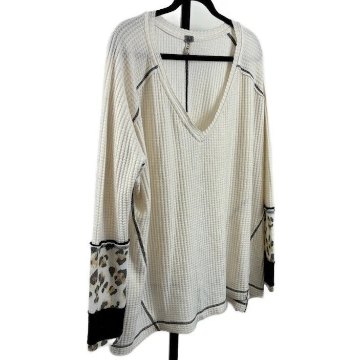 Excellent condition! This We The Free People Anthropologie brand Top with leopard cuffs is oversized and measures 29 inches in length, 30 inches pit to pit laid flat and has a 27 inch sleeve length. A cream waffle knit long sleeve top by We The Free. This top features a flattering V-neckline and unique leopard print cuffs with black trim. Contrasting stitching details add to the relaxed aesthetic. Perfect for a casual day out or a laid-back weekend.