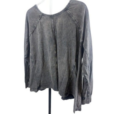 A washed charcoal grey long sleeve top by We The Free. It measures 25 inches in length, is 26 inches pit to pit, and has a 24 inch sleeve length. This top features a relaxed fit with a scooped neckline and raglan sleeves. The fabric has a unique distressed and washed appearance, adding a vintage-inspired, lived-in feel. Panel detailing on the front and back creates subtle structure and visual interest. Perfect for casual everyday wear, layering under jackets, or pairing with jeans for a laid-back look.