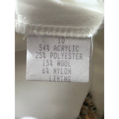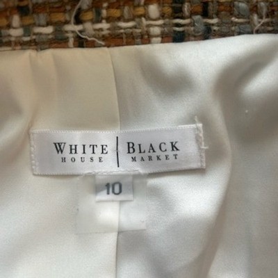 White House Black Market tweed belted blazer jacket in size 10. This stylish piece showcases a textured tweed fabric in a brown and multi-color palette, accented with fringed details along the collar and hemline. A matching fabric belt cinches the waist for a flattering silhouette. Ideal for adding a sophisticated touch to your professional attire or for a chic evening out.