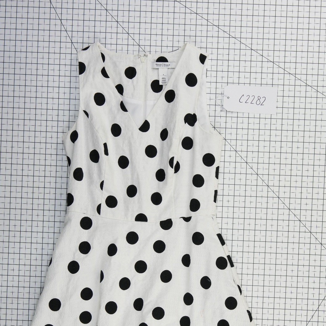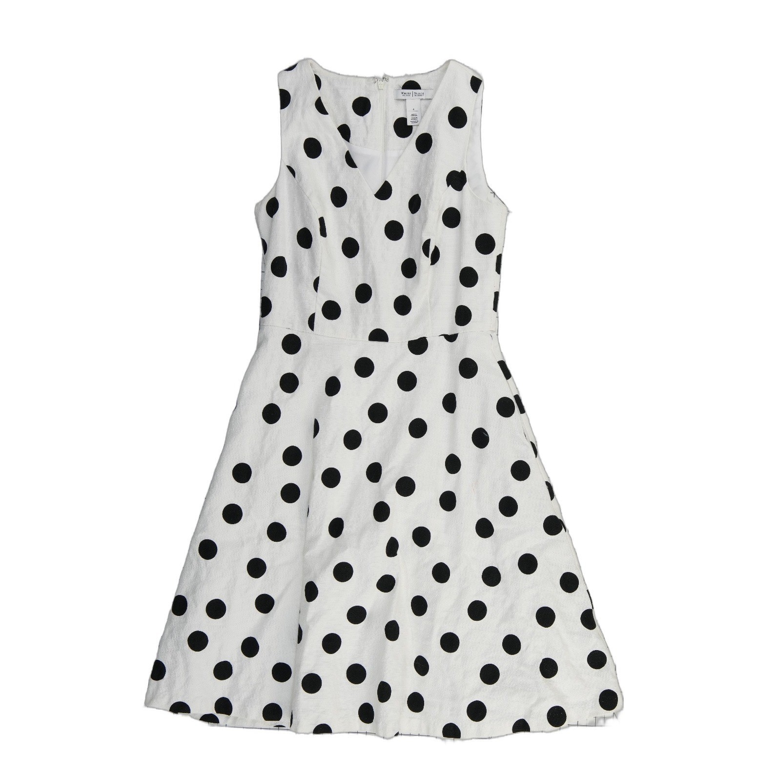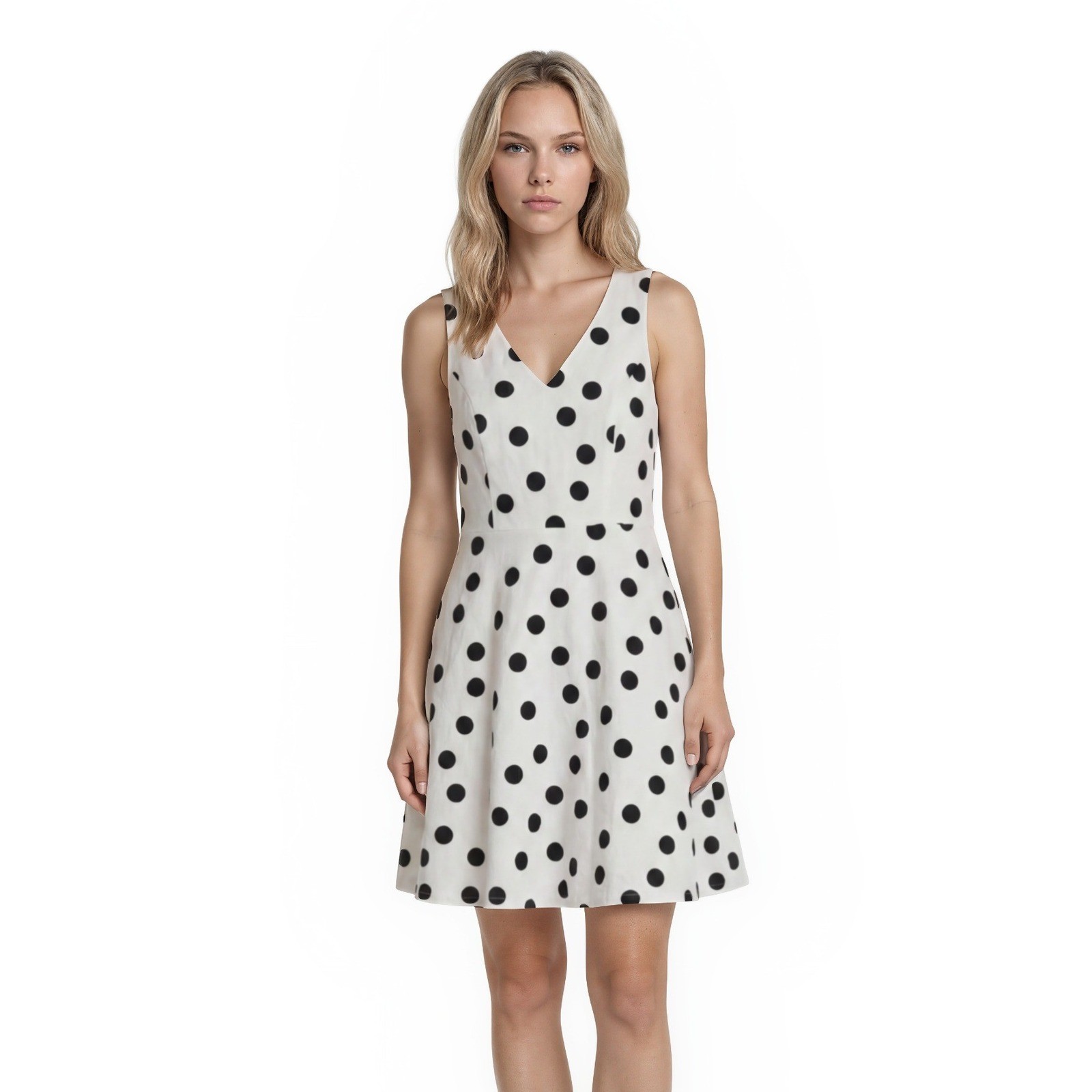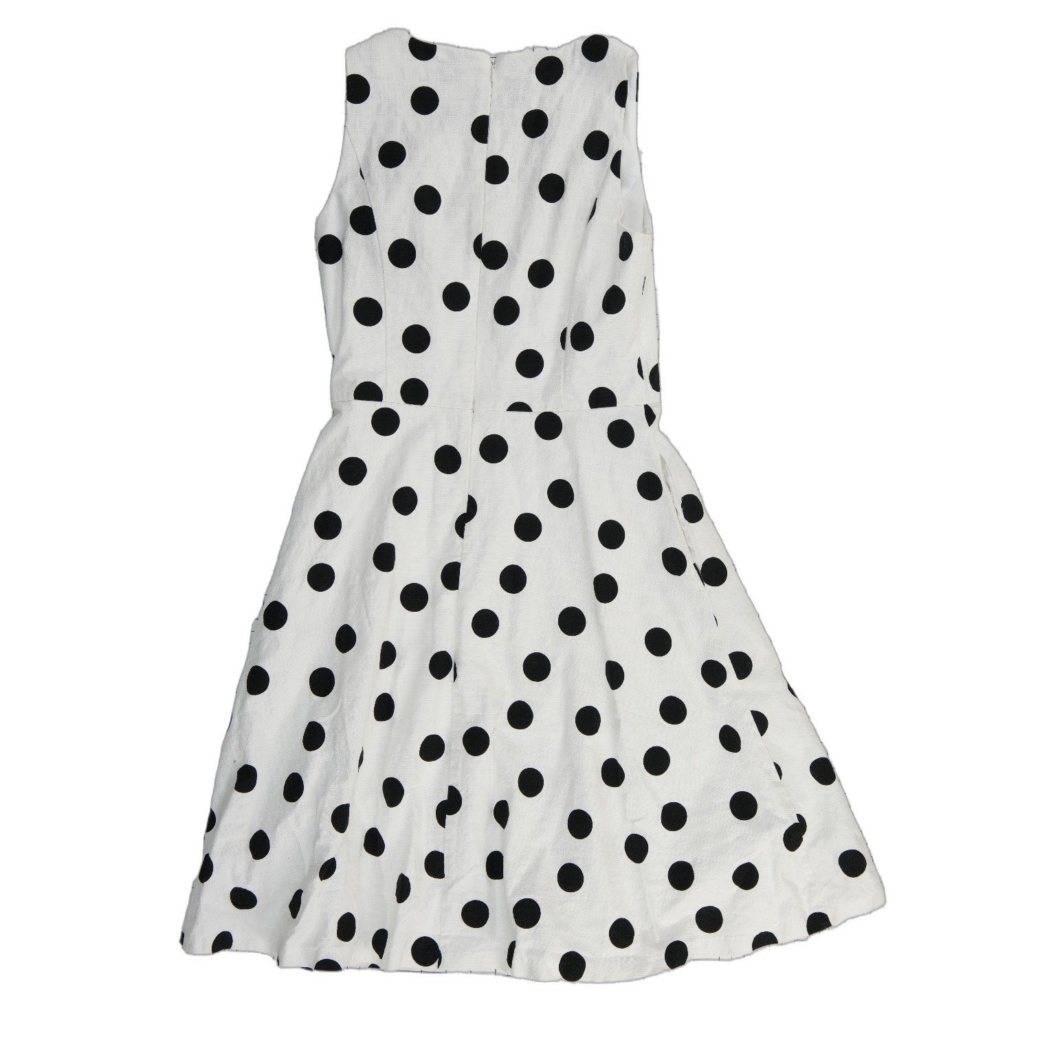 Excellent Condition! Sleeveless fit and flare dress features a classic polka dot print on a textured cotton-blend fabric. Designed with a flattering V-neckline and a structured bodice, this piece flows into a playful A-line skirt. The back is finished with a hidden zipper closure for a seamless look, while the lightweight lining ensures comfort throughout the day. Perfect for garden parties, brunch, or office wear, this timeless dress offers a sophisticated yet whimsical aesthetic.