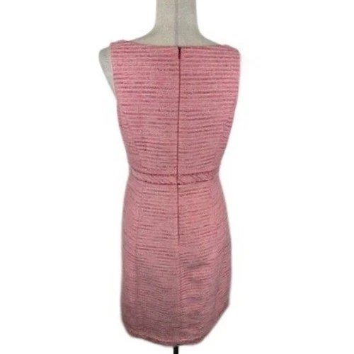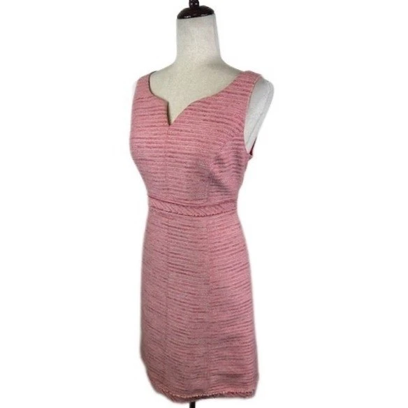 Like new! Chic sleeveless sheath dress in a textured pink tweed. This elegant dress features a flattering V-neckline and a defined waist, creating a sophisticated silhouette. The dress is fully lined, ensuring a comfortable and smooth fit. The tweed fabric adds a touch of luxury and refinement, making it suitable for both professional and semi-formal settings. Pair it with heels for a polished office look, or dress it down with sandals for a brunch date.