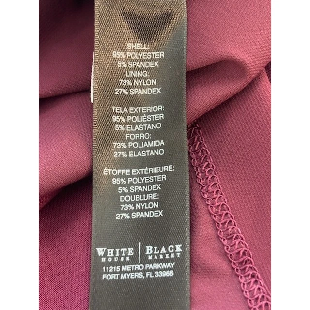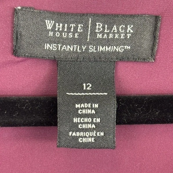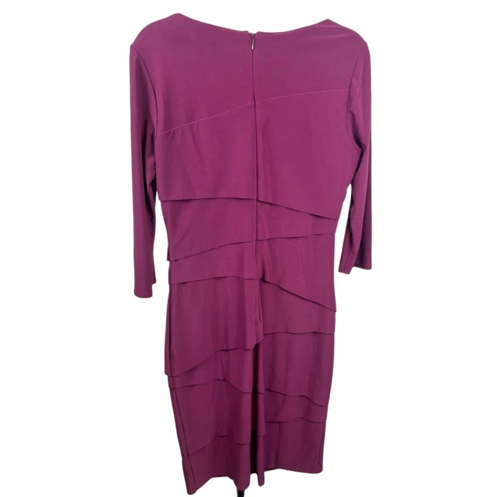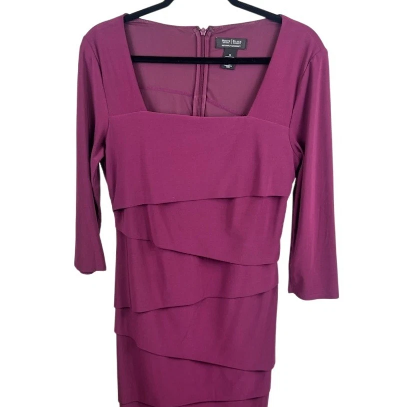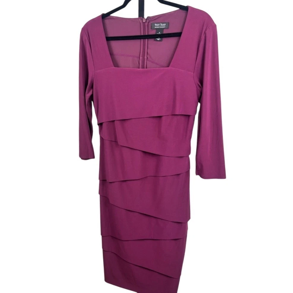 This dress measures 39 inches long. A sophisticated purple sheath dress from White House Black Market. This dress features a flattering square neckline and elegant 3/4 length sleeves. The tiered ruffle detailing adds a touch of modern flair and visual interest to the design. The “Instantly Slimming” technology ensures a smooth and sculpted silhouette. Perfect for a cocktail party, a wedding guest outfit, or an elegant evening out.