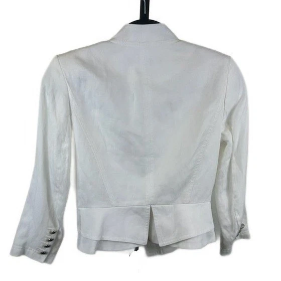 Chic white military-inspired jacket for a smart, sophisticated look. This cropped jacket features a unique double-breasted design with decorative silver-tone buttons, adding a touch of elegance and structure. The notched lapel and shoulder epaulettes enhance the military aesthetic, while the tailored fit creates a flattering silhouette. This jacket is perfect for adding a polished touch to both casual and formal outfits. Pair with tailored trousers for a business-casual event or dress it down with jeans for a stylish everyday look. Great for brunch with friends or a sophisticated dinner date.