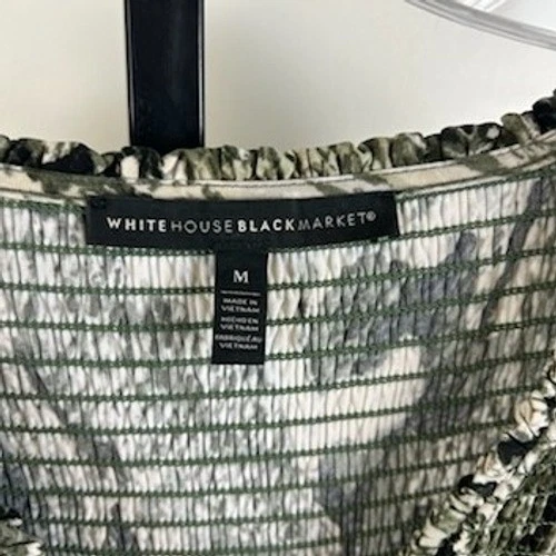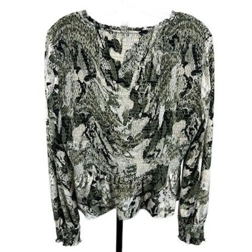 White House Black Market snake print blouse with a flattering V-neck and smocked bodice. Features long sleeves with ruffled cuffs. This versatile top is perfect for a night out or a chic daytime look.
