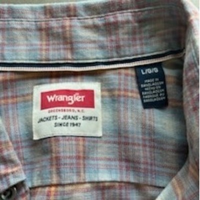 Keywords: Wrangler, western shirt, plaid shirt, long sleeve, button up, mens shirt, casual shirt, large, L, brown plaid, blue plaid, western wear, cowboy shirt, rodeo shirt