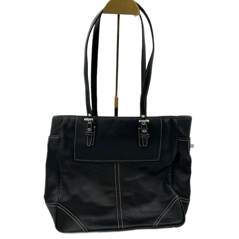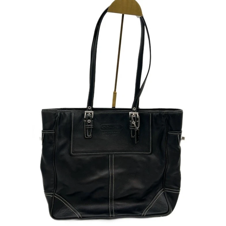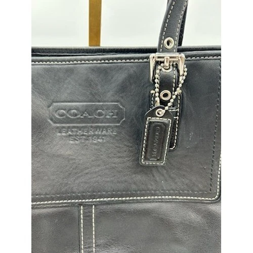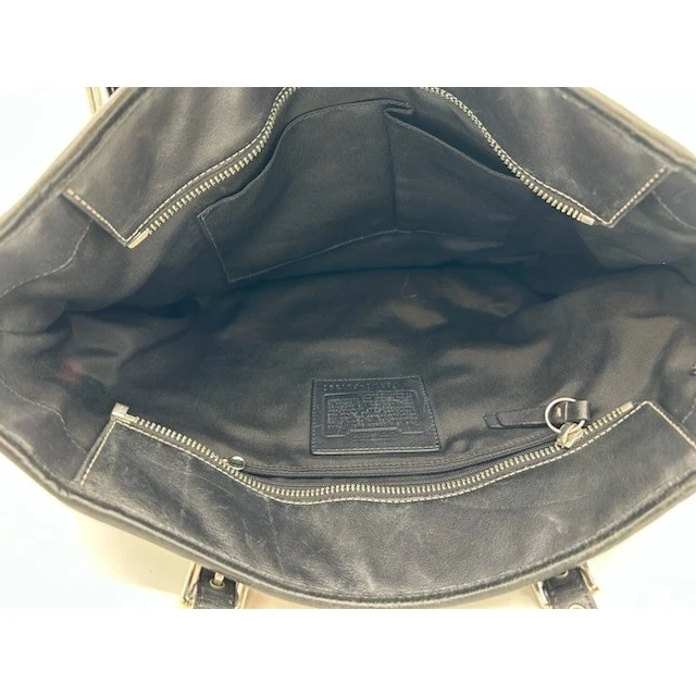 Excellent condition! Classic leather Hampton tote bag by Coach, a stylish and functional addition to your accessory collection. This sophisticated bag features a timeless design with a structured silhouette, accented by elegant white stitching and silver-tone hardware. It includes a spacious interior with multiple pockets for organization and a secure zip closure to keep your belongings safe. The exterior offers additional storage with side pockets and a signature Coach logo emblem. The bag is versatile enough for everyday use, whether you’re heading to work, running errands, or enjoying a weekend outing.