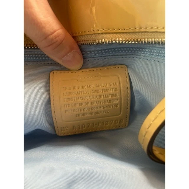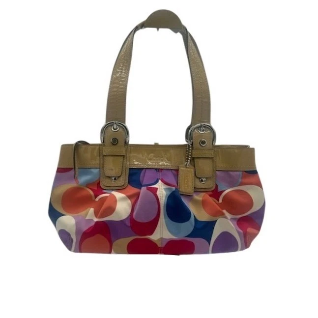 A burst of color and sophistication, this Coach satchel is a statement piece that elevates any ensemble. The vibrant Op Art print dances across the fabric, framed by sleek patent leather trim that adds a touch of luxury. Silver-tone hardware gleams, complementing the bag’s playful yet polished aesthetic. Inside, a spacious interior with a light blue lining awaits, ready to organize your essentials with ease. Perfect for adding a pop of personality to your everyday errands or for making a stylish statement at a weekend brunch, this Coach satchel is sure to turn heads.